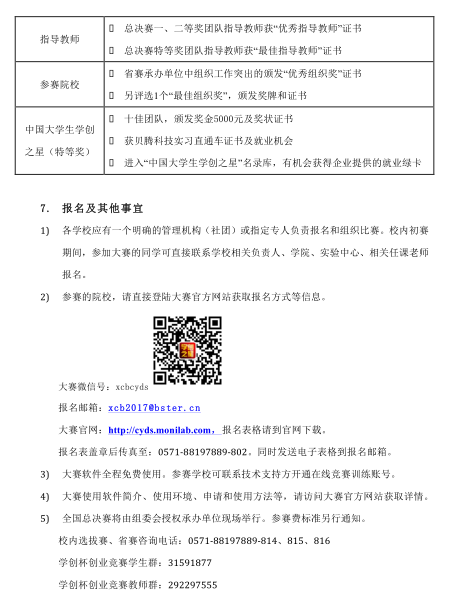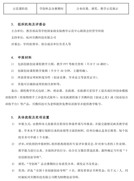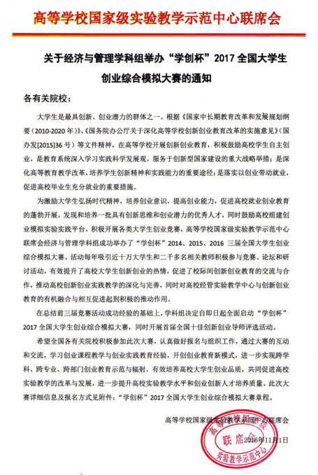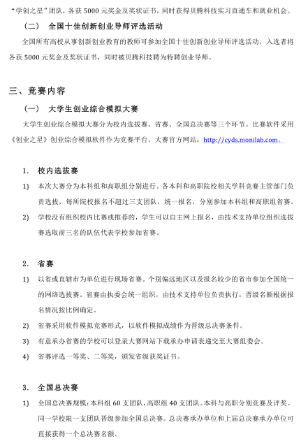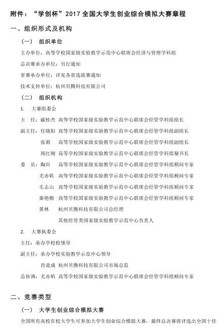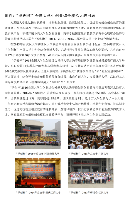 附件1:学创杯2017全国大学生创业大赛暨全国十佳创新创业导师评选通知 附件2:学创杯2017全国大学生创业大赛报名表(本科组) 附件3:学创杯2017全国大学生创业大赛报名表(高职组) 附件4:全国十佳创新创业导师评选报名表 附件5:学创杯2017全国总决赛承办