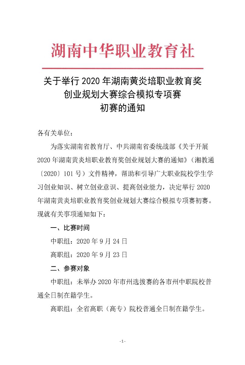 关于举行2020年湖南黄炎培职业教育奖创业规划大赛综合模拟专项赛初赛的通知