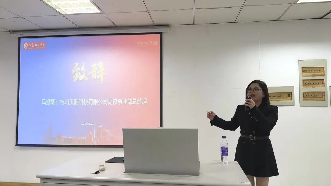 随后,由贝腾科技高校事业部总经理马姗姗女士致辞。她详细介绍了贝腾科技在创新创业领域的发展历程、成绩及“产学合作协同育人”项目,该项目是国家为了本科人才培养质量,深化产教结合、校企合作,教育部高等教育司组织有关企业支持高校共同开展产学合作协同育人的项目。