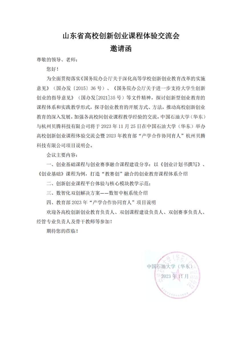 山东省高校创新创业课程体验交流会邀请函