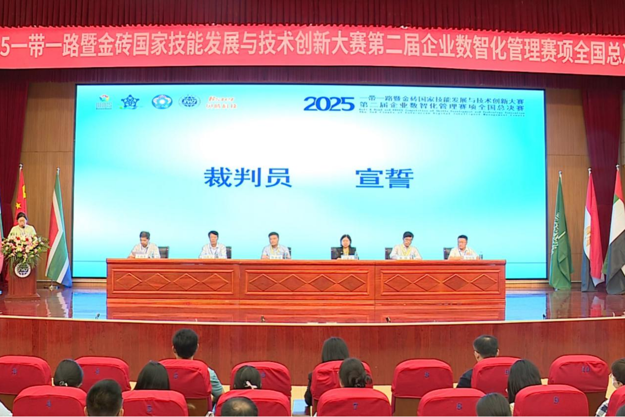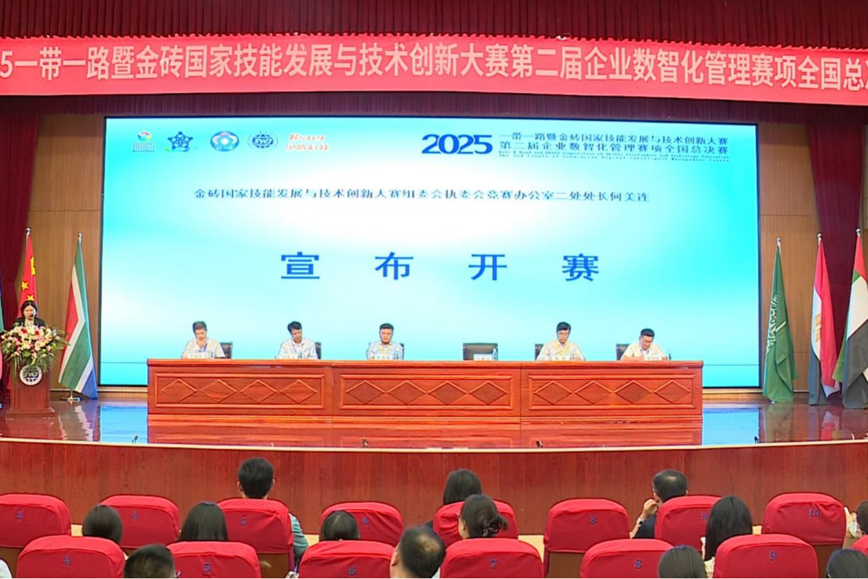 最后,金砖国家技能发展与技术创新大赛组委会执委会竞赛办公室二处处长何美连上台致辞。她强调了金砖国家框架下技能发展与技术创新合作的重要性和企业数智化管理赛项对于推动产业数字化转型的积极影响。同时,郑重宣布2025一带一路暨金砖国家技能发展与技术创新大赛第二届企业数智化管理赛项全国总决赛正式开赛。