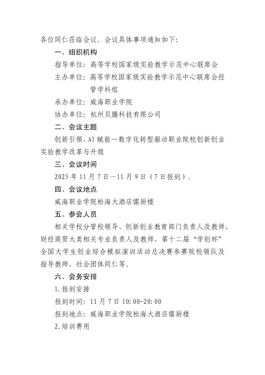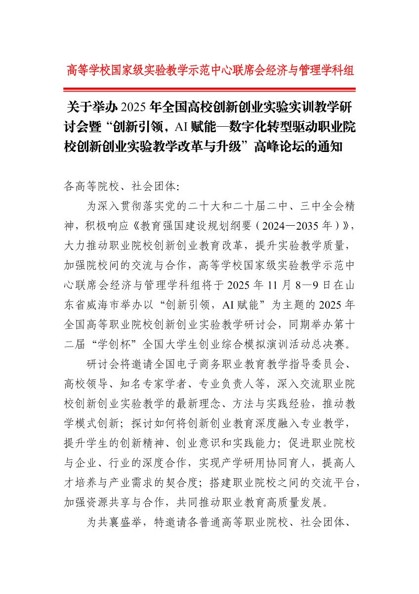 关于举办 2025 年全国高校创新创业实验实训教学研 讨会暨“创新引领,AI 赋能—数字化转型驱动职业院 校创新创业实验教学改革与升级”高峰论坛的通知