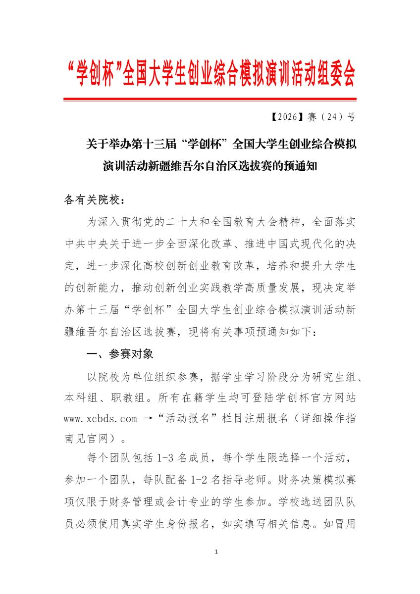 关于举办第十三届“学创杯”全国大学生创业综合模拟演训活动新疆维吾尔自治区选拔赛的预通知