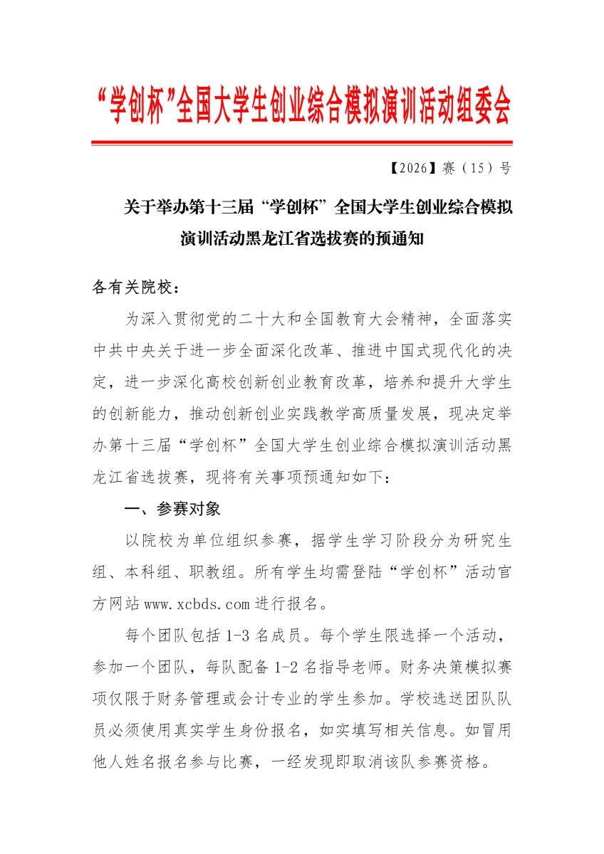 关于举办第十三届“学创杯”全国大学生创业综合模拟演训活动黑龙江省选拔赛的预通知