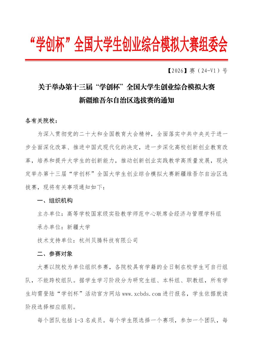 关于举办第十三届“学创杯”全国大学生创业综合模拟大赛新疆维吾尔自治区选拔赛的通知