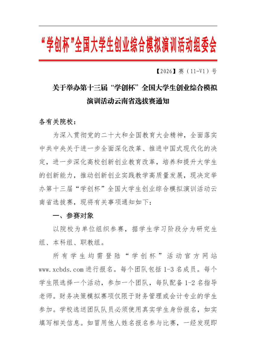 关于举办第十三届“学创杯”全国大学生创业综合模拟演训活动云南省选拔赛通知